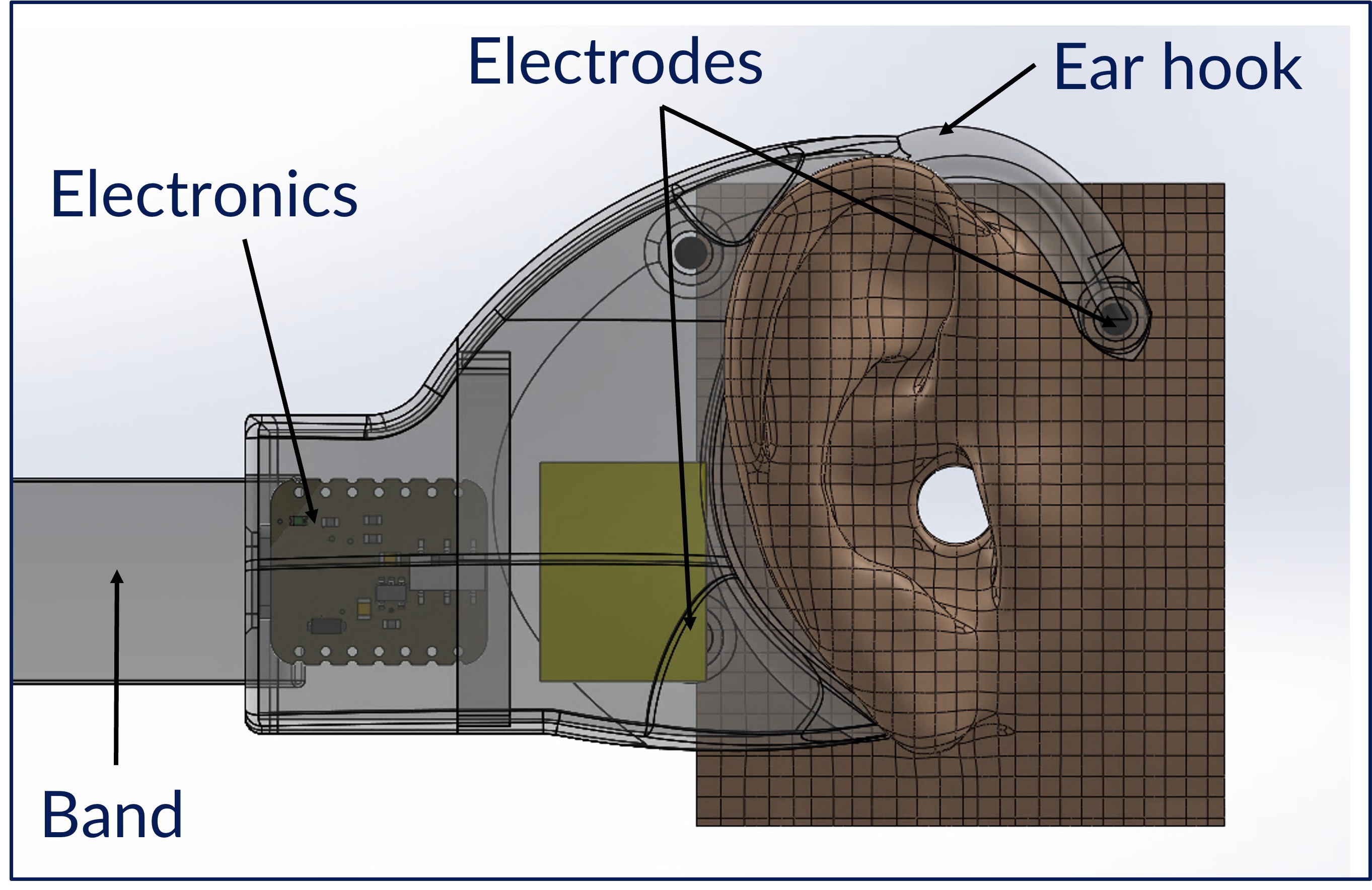 The design needed to fit around an average-sized ear, and also have space for electrodes to be caputred in the device casing.